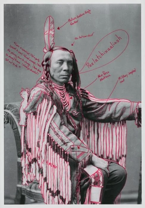 LP: I wanted to ask you more about the hand in your work, about how it can operate as a metaphor of care: like in the Bíiluuke (Our Side) series, where your hand is photographed engaging Crow objects, or in the Crow Delegation series, where, as a viewer, I imagine your hand in the process of outlining or annotating the original photographs. Could you say more about seeing, touching, and holding - and what seeing might have to with our hands?